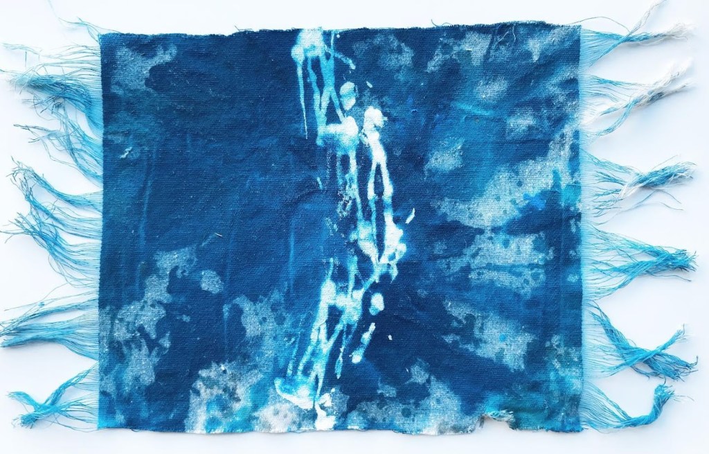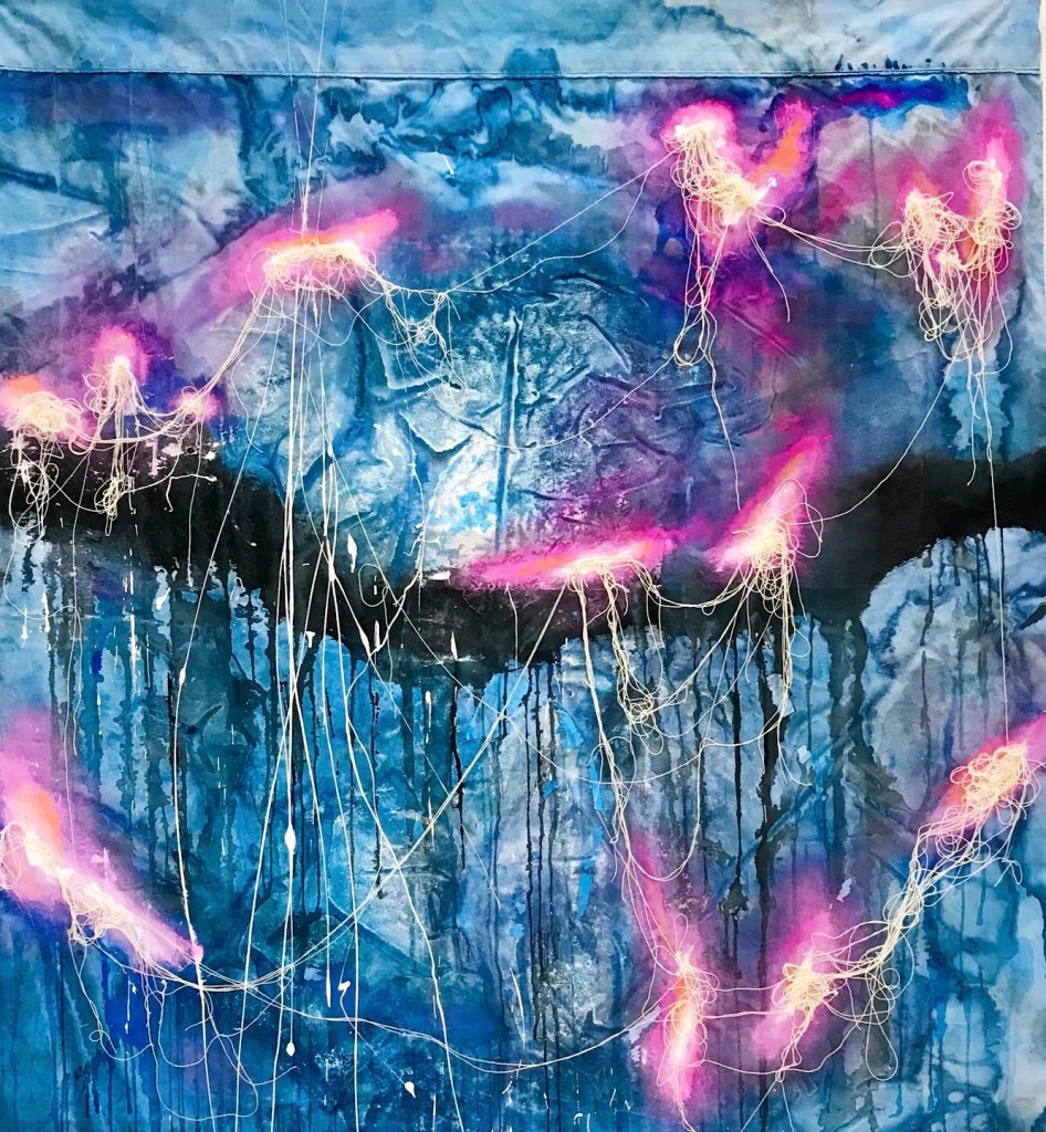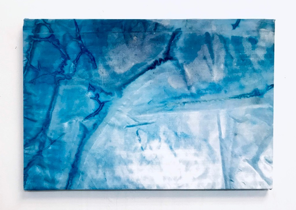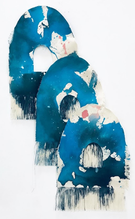 Through my paintings I create abstracted landscapes in an attempt to trick myself into feeling present and at peace. Large, fluid swaths of color meant to mimic calmness sprawl across pieces of raw canvas, and are deconstructed to reveal fringe. Creating the fringe is a full body process to develop lightness and clarity, and the remnants of color are ghosts from the act of unraveling. These pieces are often unstretched to mirror blankets and further emphasize the need for comfort.