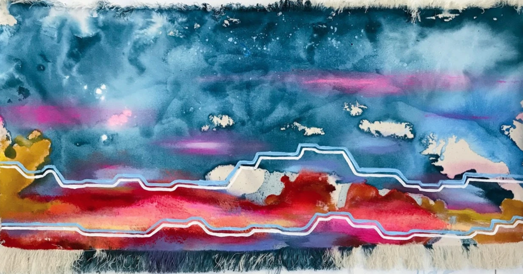 Pouring colors on the surface is a quick and violent process which fights off unsettling memories. For me, blue represents the sky and brain. It is limitless and comforting, while warm colors represent the land in an effort to feel more grounded and safe. In smaller works on paper, I paint multiple landscapes with repeating motifs at once to untangle my brain and create new, imagined spaces.